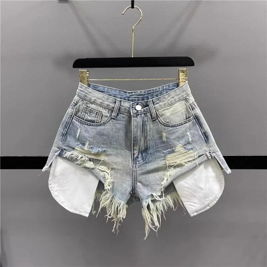 Korean Vintage Blue Sexy Ripped Jeans for Women Patchwork A-line High-waisted Denim Ultra Shorts